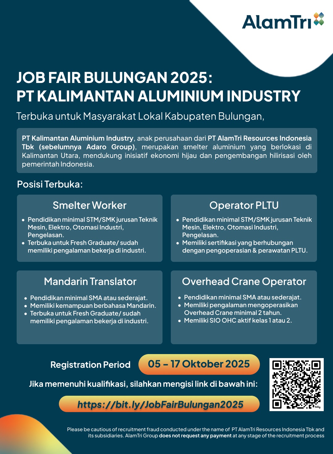 Bulungan, Kalimantan Utara — Kabar gembira bagi para pencari kerja di wilayah Bulungan! PT Kalimantan Aluminium Industry (KAI), anak perusahaan dari PT AlamTri Resources Indonesia Tbk (sebelumnya Adaro Group), membuka kesempatan kerja melalui Job Fair Bulungan 2025 yang digelar khusus untuk Putra Putri di Kabupaten Bulungan.
